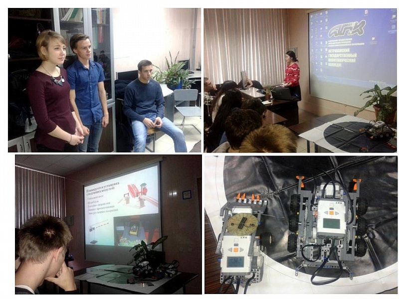 Присутствующие студенты АГУ занимаются созданием и конструированием роботов во внеаудиторное время. Разрабатывают необходимое программно-алгоритмическое обеспечение для управления такими системами, их проектирования и эксплуатации. Осуществляют предварительные замеры, выполняют «черновую» работу, в том числе расчетную, на различных этапах проекта.