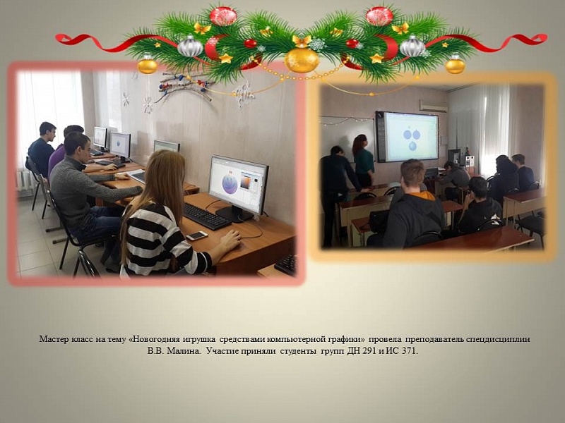 Студенты отделения ИТиД приняли участие в мастер-классе «Новогодняя игрушка средствами компьютерной графики». Преподаватель спецдисциплин В. В. Малина провела это мероприятие для студентов вторых, третьих курсов. Процесс создания новогодней игрушки творческий, увлекательный! Изменить цвет, форму, композицию – это ли не мечта любого начинающего дизайнера!