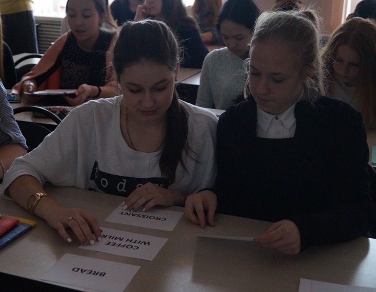 Открытое занятие по дисциплине «Иностранный язык» по теме «Food» прошло в группе БД 124. Игровая форма выбрана преподавателем Л. В. Яицковой неслучайно, так как именно игру можно расценивать как самую точную модель общения, она подражает действительности, в ней, как и в жизни переплетается речевое и неречевое поведение партнеров.