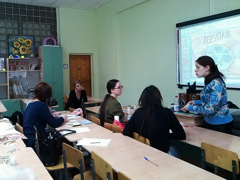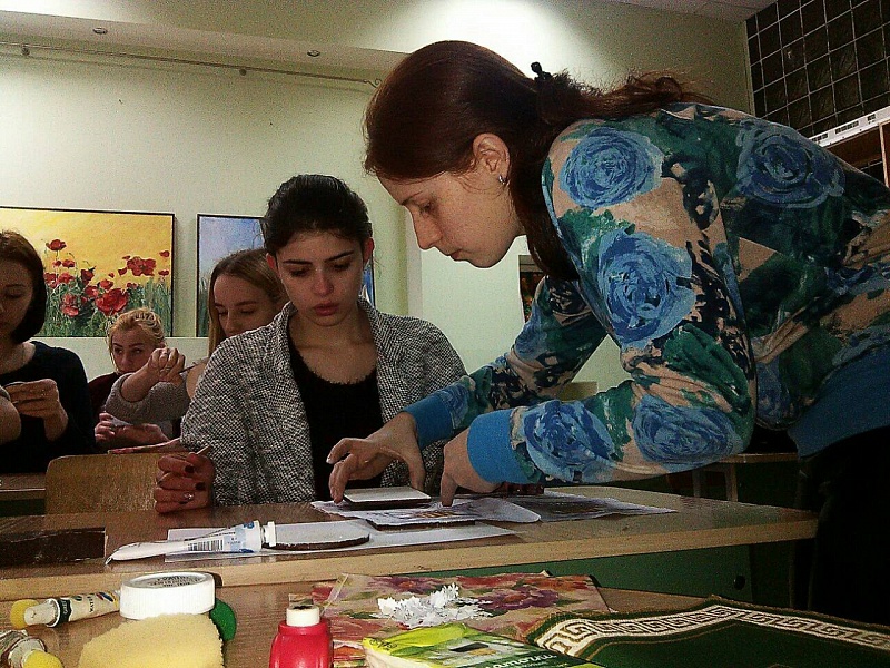 Преподаватель направления дизайн Л.С. Колесник провела мастер-класс по де купажу для студентов колледжа. Техника, которая позволяет любому человеку при желании создавать художественные работы. Цветы, замки, шары – любой полет творческой фантазии, возможно, реализовать в данной технике! Каждый сможет повторить понравившийся рисунок с помощью переноса его на любую поверхность.