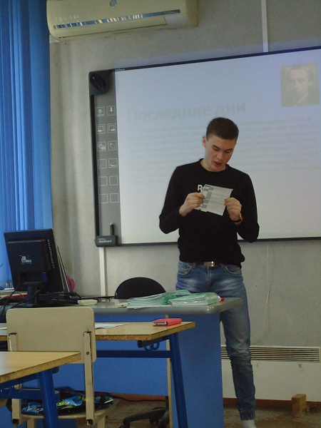 12 марта в группе КС274 под руководством куратора Дмитриевой С.К. прошел классный час, посвященный 120-летию со дня рождения Велемира Хлебникова. В импровизированной гостиной студенты читали стихи поэта-футуриста, посмотрели презентацию по биографии земляка, завершением мероприятия стала викторина по творчеству астраханца В. Хлебникова.