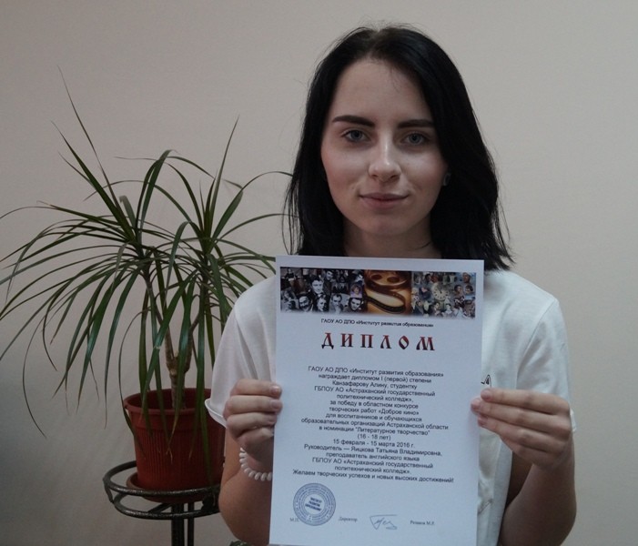 Поздравляем студентку гр. ТЭ - 114 Канзафарову Алину с победой в областном конкурсе творческих работ «Доброе кино» для воспитанников и обучающихся образовательных организаций Астраханской области в номинации «Литературное творчество».
