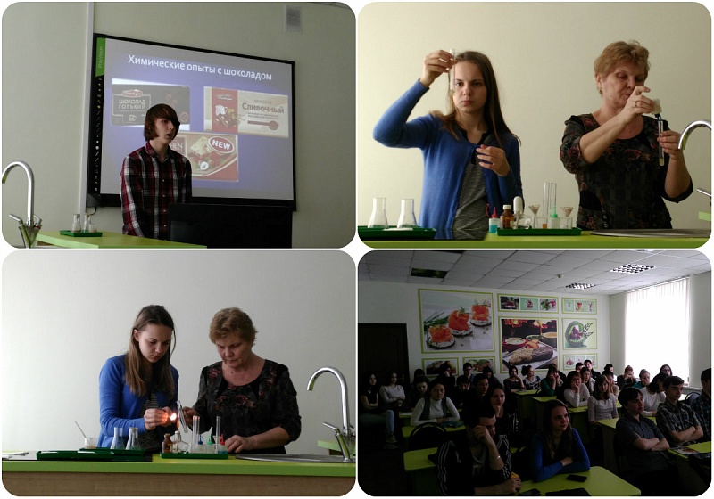 На отделении сервисных технологий в рамках методической недели состоялось учебная конференция «Шоколад – вред или польза». Студенты первого курса групп специальности «Технология продукции общественного питания» и «Гостиничный сервис» выявили все «плюсы» и «минусы» столь любимого всеми лакомства. Под руководством Натальи Николаевны Чириковой провели химические опыты с шоколадом различных известных производителей. Учебная конференция позволила студентам поделиться открытиями в области химии на основе шоколада.