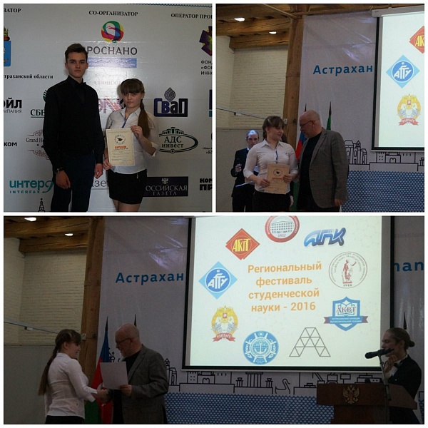 Лауреатами фестиваля студенческой науки стали 20 проектных команд. Одним из лучших научных разработок признан проект студентов отделения Экономики и права Мамонтовой Анастасии, Батраковой Алены, Анпольского Даниила "Плесневые грибы как индикатор натуральности продуктов питания" (руководители Чирикова Н.Н., Тураева Е.П., Кандальская О.В.). Интерес работа конкурсантов вызвала не только у губернатора Астраханской области Александра Жилкин и министра образования и науки Астраханской области Виталия Гутмана, но и у Генерального директора Управления по международным связям и PR Технопарка «ПАРДИС» (г. Тегеран), бизнесменов, молодых ученых, а также студентов и школьников.