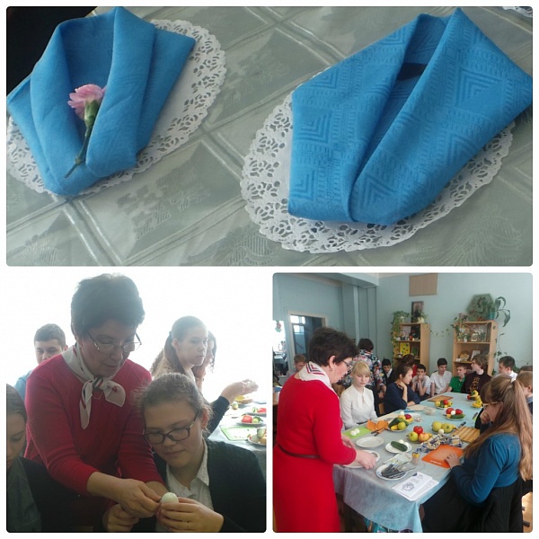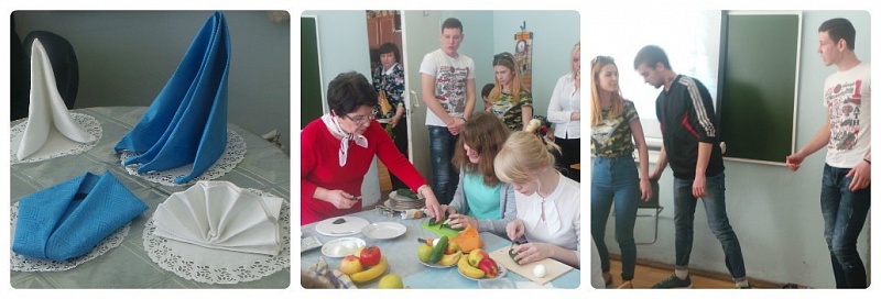 Преподавателем специальных дисциплин Умеровой Т.А. совместно со студентами был проведен мастер-класс по сложной нарезке из овощей и фруктов для оформления банкетных блюд и продемонстрированы виды складывания салфеток, которые вызвали живой интерес у школьников.