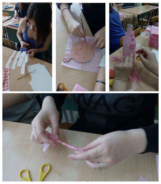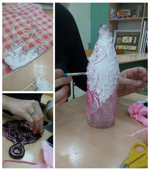Выкладывается узор влажными салфеточными нитями, а для приклеивания используется ПВА.