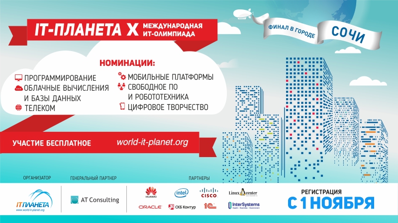 1 ноября на сайте world-it-planet.org началась регистрация участников самого крупного образовательного IT-события на пространстве СНГ – X юбилейной Международной олимпиады в сфере информационных технологий «IT-Планета 2016/17», финал которой состоится в мае 2017 года в городе Сочи. Ожидается, что в «IT-Планете 2016/17» примут участие не менее 15 000 участников из 900 вузов и колледжей России и стран СНГ, а также стран БРИКС. Весь ноябрь организаторы будут принимать заявки на сайте соревнований от студентов вузов и ссузов любой формы обучения, а также от молодых дипломированных специалистов в возрасте до 26 лет. Отличительная черта олимпиады «IT-Планета» – 100%-ная реалистичность заданий. Все задания основных этапов являются прикладными и разрабатываются непосредственно будущими работодателями, что позволяет участникам окунуться в атмосферу реальной трудовой деятельности. Генеральным партнером и спонсором «IT-Планеты 2016/17» выступает российская компания AT Consulting, лидер на рынке ИТ-услуг в России и СНГ. Компания предлагает инновационные IT-решения для телекоммуникационного, финансового, производственного, топливно-энергетического и государственного секторов экономики. Партнерами и организаторами конкурсов юбилейной ИТ-Олимпиады выступают такие российские и международные лидеры ИТ-рынка, как 1С, Cisco, Huawei, Intel, InterSystems, Oracle, СКБ Контур, ГНУ/Линуксцентр, ГК «Кортексплюс» и другие компании. Соревнования проходят при поддержке Министерства образования и науки России и Министерства связи и массовых коммуникаций РФ, а также Агентства стратегических инициатив (АСИ). В этом году участники смогут проявить свои практические навыки в 15 конкурсах по 6 номинациям: «Программирование», «Мобильные платформы», «Телеком», «Облачные вычисления и базы данных», «Свободное программное обеспечение и робототехника» и «Цифровое творчество». Каждый этап олимпиады – это возможность проверить уровень своего профессионализма и получить приятные бонусы от спонсоров и организаторов: сертификаты об участии в соревнованиях, медали и подарочные сертификаты от спонсоров. Также участники смогут лично пообщаться с экспертами – представителями крупных IT-компаний, задать интересующие их вопросы и получить исчерпывающие ответы. Завершится олимпиада ярким Международным финалом, который пройдет в мае 2017 г. в Сочи при поддержке Всероссийского конкурса IT-стартапов «Море идей на берегу моря». Лучших из лучших обязательно заметят представители крупнейших компаний ИТ-сферы, и участники смогут сделать первые шаги навстречу своей успешной карьере!