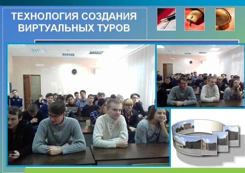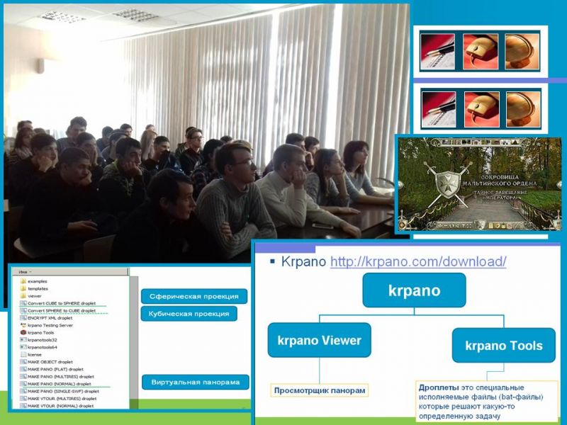 Особенно ценной была для студентов информация, касаемая программного обеспечения, позволяющего создавать виртуальные туры. Лектор продемонстрировала возможности программ, а также показала примеры программных кодов, необходимых для создания того или иного эффекта анимации. Лекция вызвала живой интерес у студентов, многие из которых заинтересовались специализированным программным обеспечением и, надеемся, будут его успешно использовать.