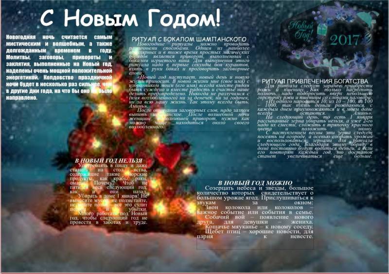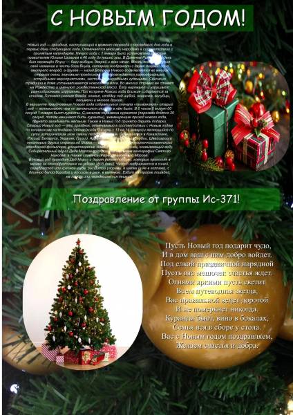 Уже не за горами Новогодние праздники, которые так обожают и взрослые, и дети. Не за горами поздравительные открытки, письма, выбор подарков и их вручение. Не за горами покупка нарядов и разработка праздничного меню. И, конечно же, не за горами планы по украшению помещения, где должен состояться этот большой и веселый праздник. Не остались в стороне и образовательные учреждения. Студенты колледжа уже украсили коридоры и кабинеты. Среди украшений и поделки, выполненные собственными руками студентов. Так, активное участие в оформление рекреаций колледжа приняли студенты группы ДН291 под руководством преподавателей Колесник Л.С., Мяте Н.А., Кашина Н.А. Всегда радуют глаз и новогодние газеты и плакаты. В канун Нового года на отделении информационных технологий и дизайна в группе ИС371 в рамках учебной практики был проведен конкурс новогодних плакатов. Плакат необходимо было разработать и сверстать в специализированной программе для верстки Scribus. В плакате оценивалось оригинальное информационное послание, лучшее поздравление от группы преподавателям и студентам колледжа, и красочный дизайн, передающий образ праздника! Победителями конкурса по мнению руководителей практики Крутовой Л.А. и Никитиной В.В. признаны: