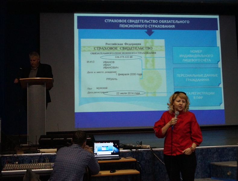 И.К. Ткачева – ведущий специалист Пенсионного фонда РФ, Е.Г.Назарова – специалист пенсионного отдела и представитель Пенсионного фонда Е.А.Посохов рассказали присутствующим об истории пенсий в России, о том, как устроена российская пенсионная система, познакомили присутствующих с порядком начисления пенсии, способах её формирования, особенностями пенсионных накоплений, поделились секретами формирования достойной пенсии.