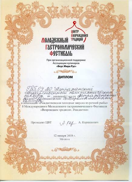 В январе 2018 г. в Трапезных палатах Храма Христа Спасителя прошел 8-й Молодежный гастрономический Фестиваль «Возрождаем традиции. Рождество» в котором приняла участие сборная команда г.Астрахани: ГБПОУ АО «АГПК».
