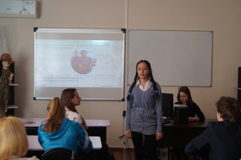 На классном часе, посвященном памяти В.С.Высоцкого студенты группы ТЭ – 114 читали стихи поэта «Братские могилы», «Полчаса до атаки», «Я не люблю», с интересом познакомились с этапами творческого пути поэта, представленным в презентации, слушали его песни, искренне сопереживали героям фильмов Высоцкого.