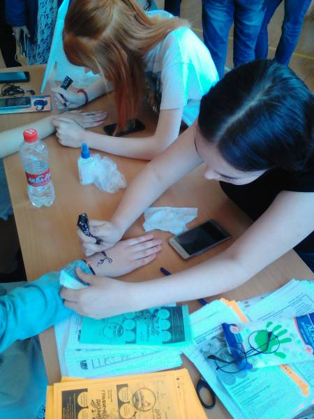 Школьники с удовольствием приняли участие в мастер-классе «Михенди» - узоры натуральной хной по телу человека, проводимый студентами 2 курса Бухоновой Анастасией и Баскаевой Анастасией.