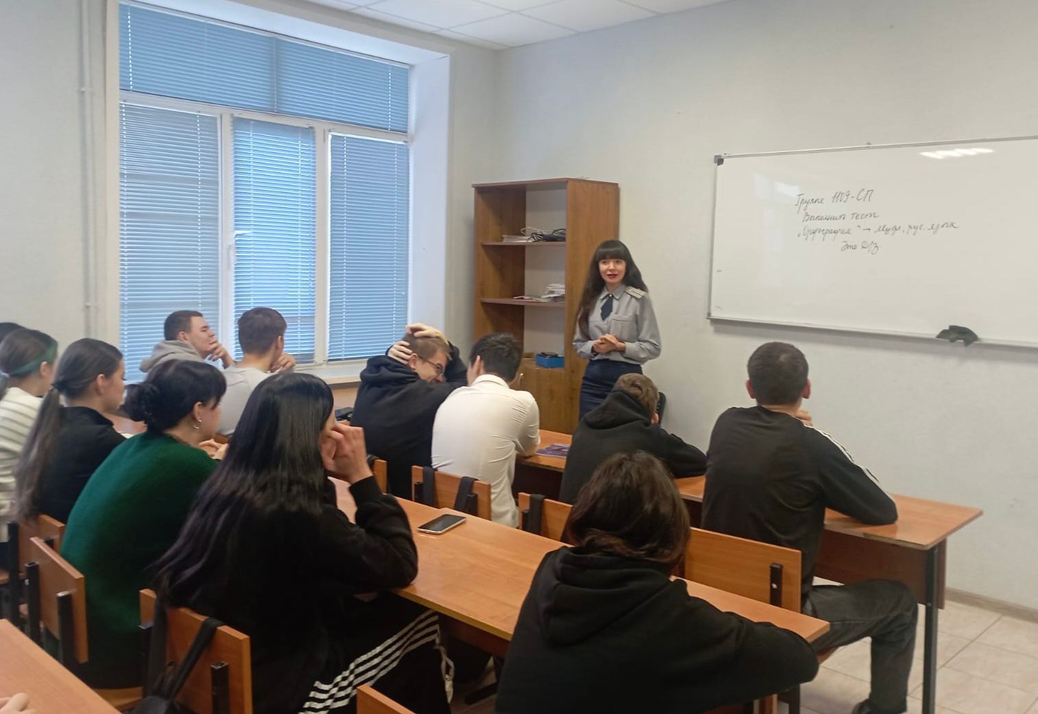 Капитан внутренней службы, психолог психологической службы УФСИН России по Астраханской области, руководитель Комитета психологов силовых структур Ассоциации «Экспертное сообщество социальных инициатив», действительный член Общероссийской Профессиональной Психотерапевтической Лиги, Щербакова Тамилла Тофиковна провела профилактическую беседу об уголовной и административной ответственности для студентов групп ЭБК-1109, СП-1109, СЭН-1109.