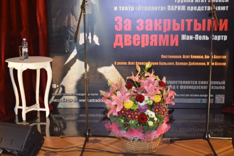 Спектакль парижского театра «Аталант» прошёл с аншлагом. Астраханские зрители тепло приняли постановку «За закрытыми дверями». Пьесу Жан-Поля Сартра относят к театру абсурда. Её представили на языке оригинала в синхронном переводе с помощью титров.