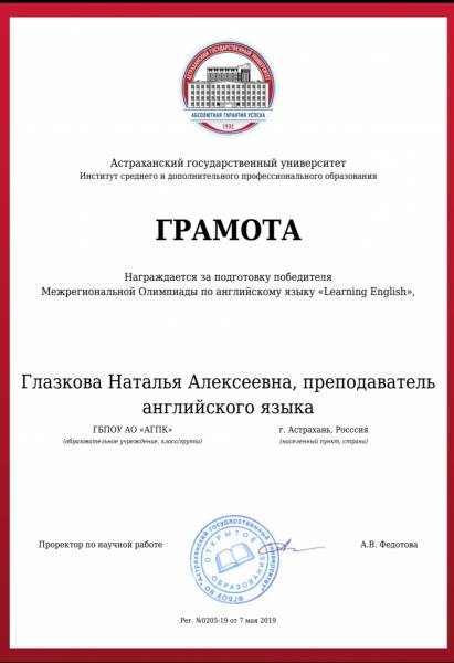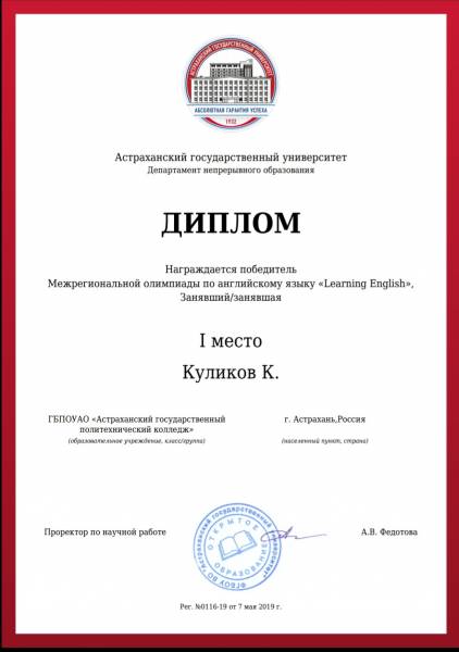 Благодарим преподавателя Глазкову Н.А. за качественную подготовку студента. Поздравляем Куликова Кирилла с победой и желаем дальнейших успехов!