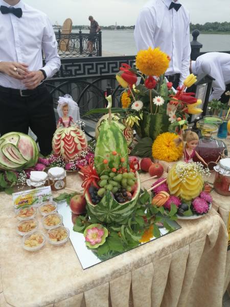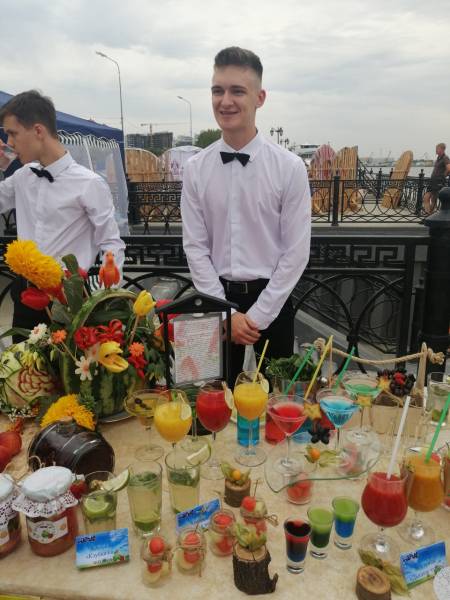 Студенты отделения сервисных технологий совместно с преподавателями Умеровой Т.А., Лариной Т.А., Салиховой Л.С., Суханбирдиевой Н.Р. выступили с выставкой и дегустацией безалкогольных коктейлей на основе арбузного сока, также продемонстрировали художественную резьбу (карвинг) на бахчевых, овощах и фруктах.