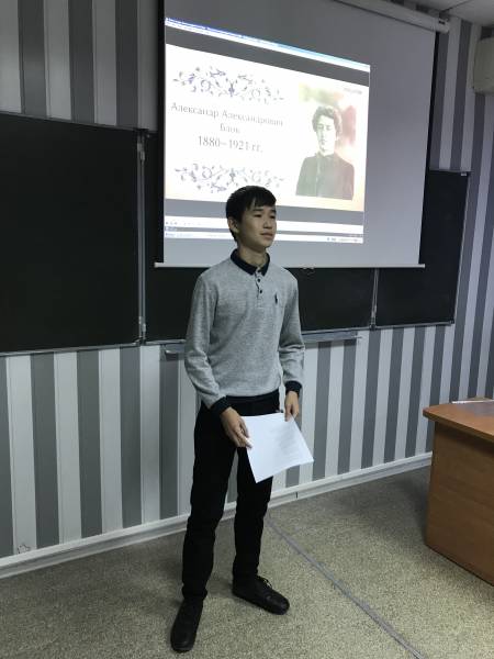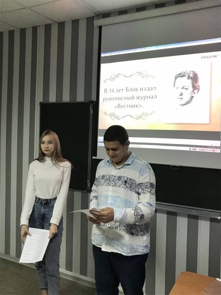 В преддверии юбилея А.А.Блока в группах ПСО – 152 и ПСО – 153 под руководством куратора И.С.Архангельской и педагога-организатора отделения информационных технологий, экономики и права И.В.Даниелян был проведен классный час, посвященный великому русскому поэту. Фрагмент фильма «Я медленно сходил с ума», стихотворения в исполнении студентов групп «О, весна без конца и без края», «Ночь, улица, фонарь, аптека» и др., познавательная презентация, вопросы викторины позволили участникам классного часа ненадолго окунуться в мир удивительного искусства поэзии и последовать совету А.А.Блока: