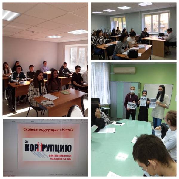 Коррупция как явление зародилось в глубокой древности. Исторические корни коррупции восходят к обычаю делать подарки, чтобы добиться расположения. Дорогой подарок выделял человека среди других просителей и способствовал тому, чтобы его просьба была выполнена. Согласно Российскому законодательству, коррупция – это злоупотребление служебным положением, дача и получение взятки, коммерческий подкуп, или иное незаконное использование своего должностного положения вопреки законным интересам общества и государства в целях получения выгоды в виде денег, ценностей, иного имущества или услуг имущественного характера. Кураторские часы по теме: «Скажем коррупции – «Нет» прошли в группах отделения информационных технологий, экономики и права и заставили обучающихся задуматься над смыслом существующей проблемы.