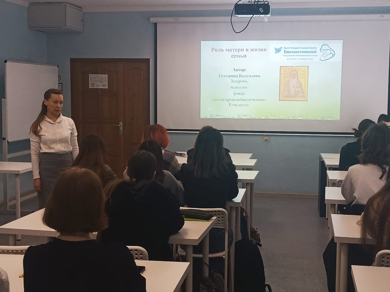 11 марта студенты групп ПК-2209 и ДН-1109 Астраханского государственного политехнического колледжа приняли участие в беседе с Екатериной Васильевной Захаровой, психологом благотворительного фонда «Елизаветинский».