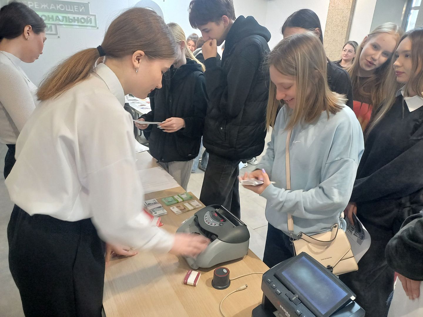 по специальности «Банковское дело» показали гостям, как пользоваться аппаратом для счёта банковских купюр и проверять их подлинность;