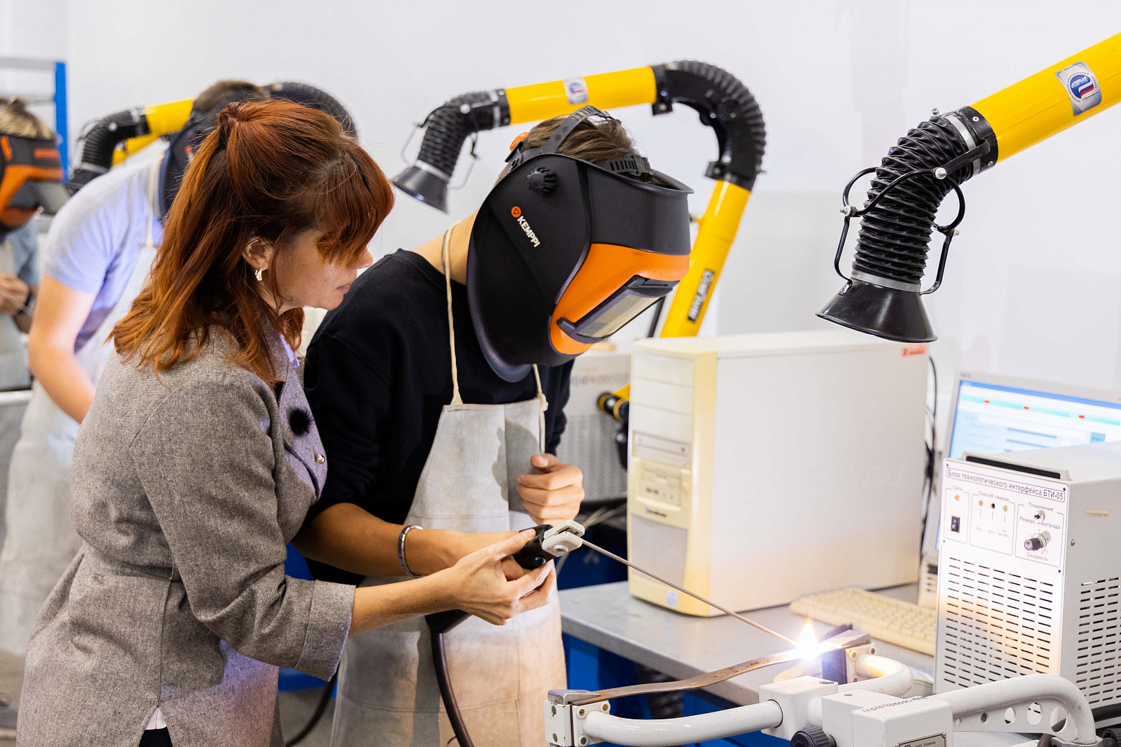 Профессиональные образовательные мастерские, созданные в АГПК в 2019 году в рамках нацпроекта «Образование», оснащены самым современным оборудованием. Это позволяет готовить высококвалифицированные кадры по востребованным в Астраханской области рабочим специальностям. Например, оборудование, представленное в мастерской «Сварочные технологии», помогает студентам освоить разнообразные виды сварки, в том числе и полуавтоматическую. Сегодня школьники могли почувствовать себя в роли сварщиков: под руководством педагогов они пробовали работать на тренажёре имитации сварочных процессов.