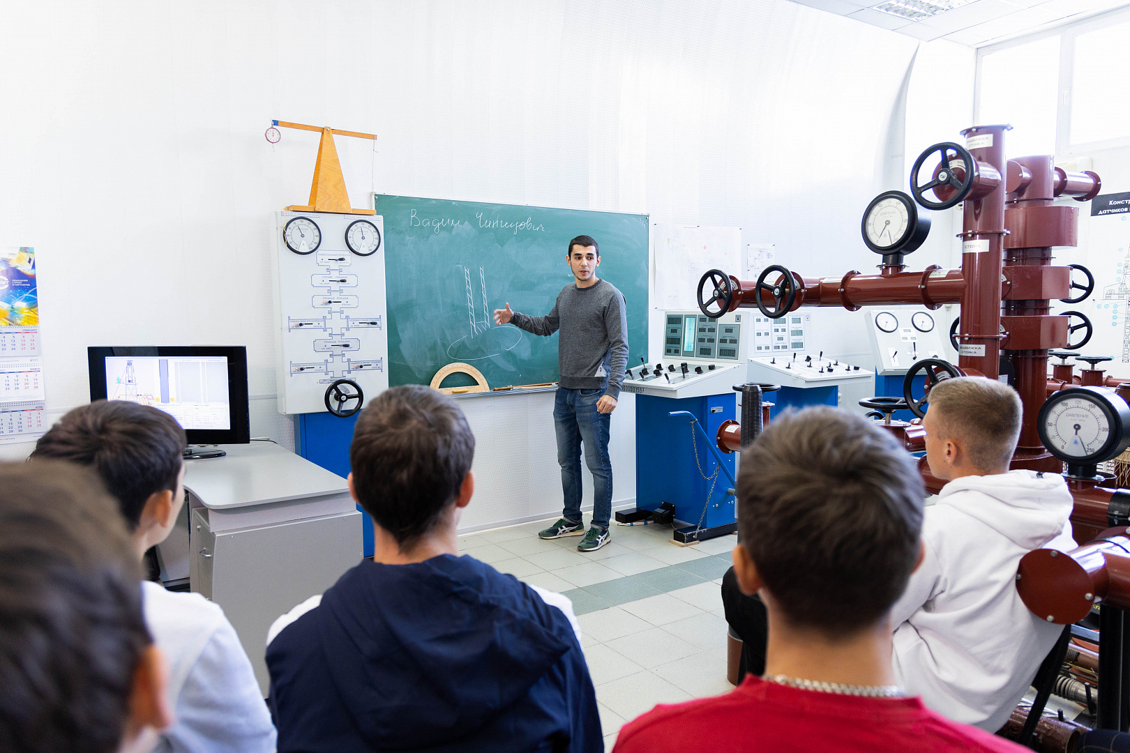 Побывали старшеклассники и в мастерской «Добыча нефти и газа». Здесь есть уникальный тренажёр, в котором осуществляется визуализация процессов в режиме реального времени, протекающих в продуктивном пласте, скважине, УЭЦН и механизированном подъёмнике. При этом имитируются реальные ситуации работы насосной установки, необходимые для отработки соответствующей реакции оператора на происходящие события. Весь процесс полностью компьютеризирован.