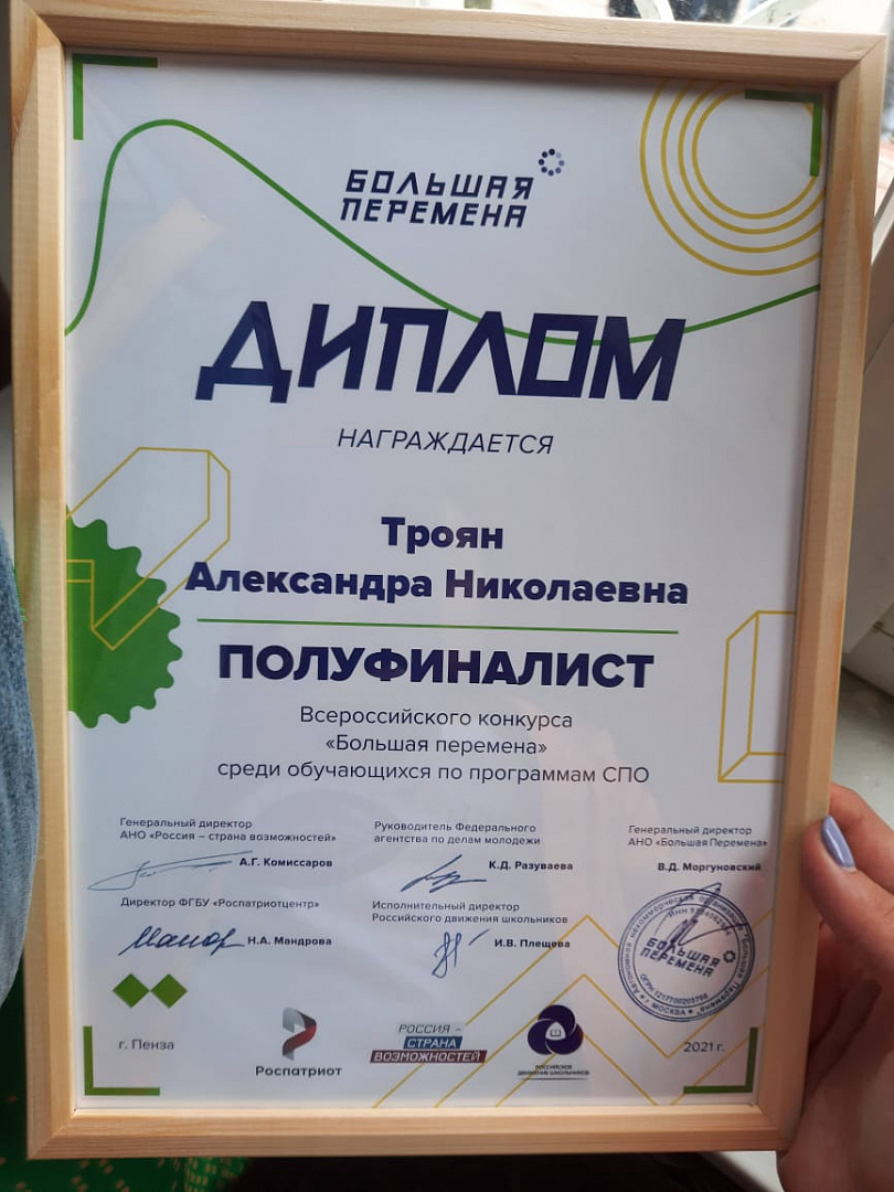 Стали известны имена финалистов Всероссийского конкурса «Большая перемена», который проходит в рамках проекта президентской платформы «Россия – страна возможностей». В их числе – студентка 3 курса отделения сервисных технологий и дизайна Астраханского государственного политехнического колледжа Александра Троян.